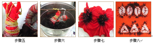 套色扎染是在单色扎染制作的基础上进行二次捆扎,最后进行二次染色。二次染色常见的技法有全部入染和蘸染。