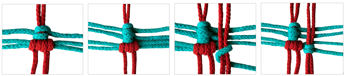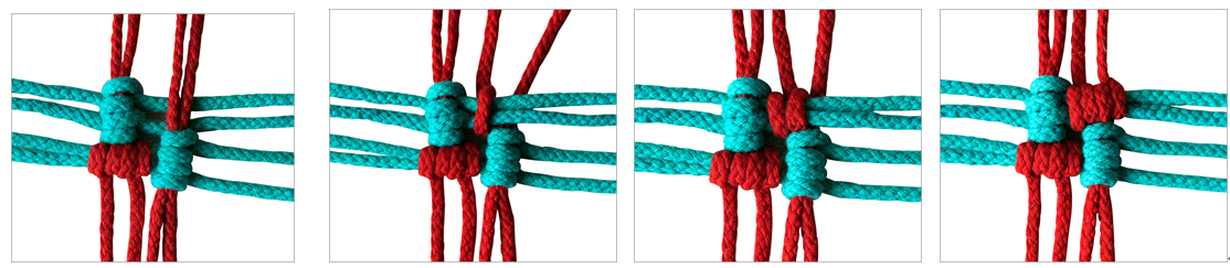 步骤九 取另外两条线绳做第二行轴线(纬线),继续做第二行的套结;