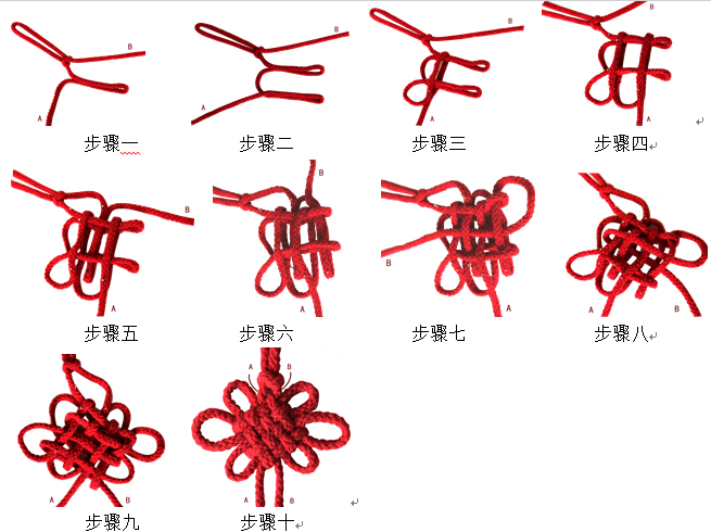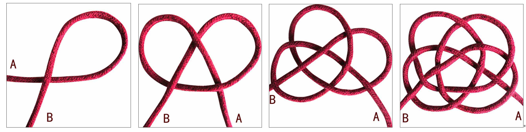 步骤四 B端线绳向右上方盘旋,压着A端线绳,抬着B端线绳,再压着A端线绳,抬着B端线绳,一直向左下方一条别着一条穿出;