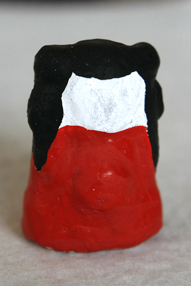 用砂纸将干透的泥塑造型进行打磨,然后用干毛笔轻轻地扫去表面的泥粉,再用白色水粉色刷底色,以薄为好,一般要刷两次。底色干后再用其它水粉色着色,色彩对比要响亮,明快,形象面部描画要精细,着色全部完成后刷亮油一到二次。