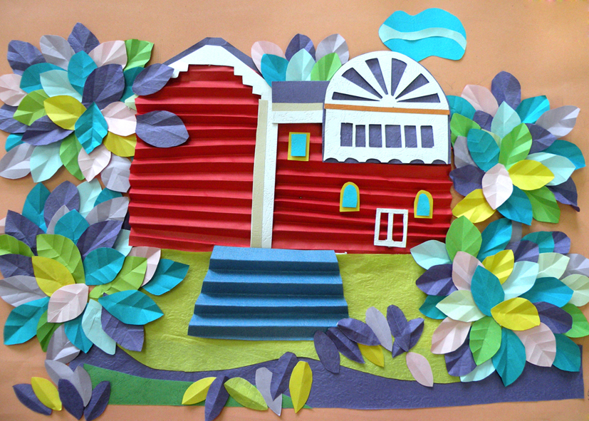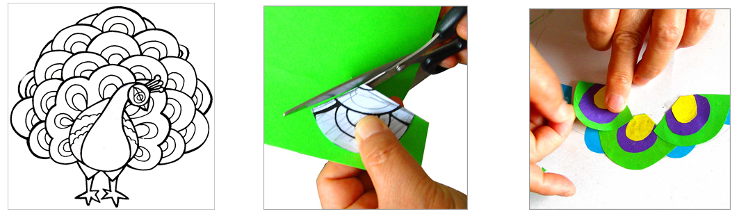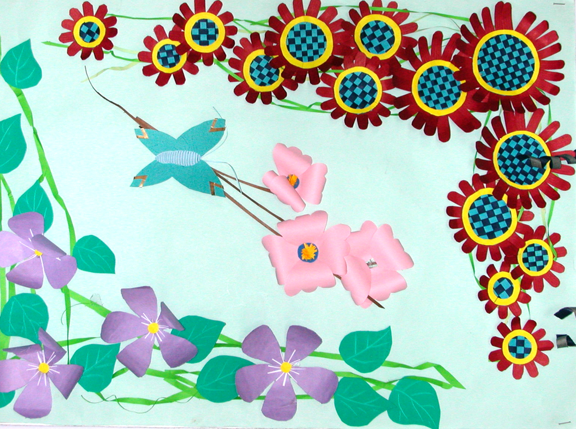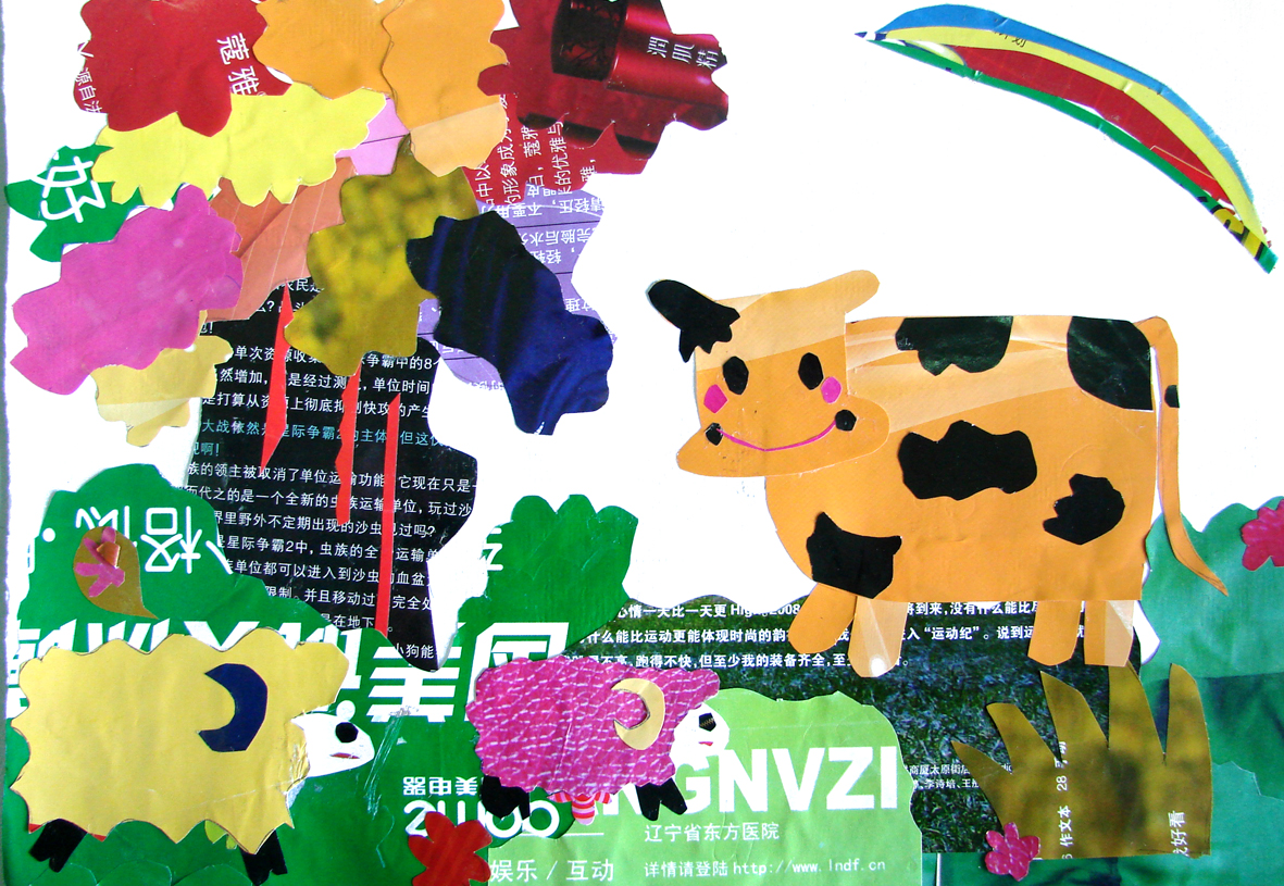 平贴是将设计好的平面构图和形象分剪成几部分纸块,运用色彩对比的方法将画面粘贴出来,其艺术效果是简洁明快。制作材料多选用彩色打印纸、薄卡纸或废旧宣传广告纸。