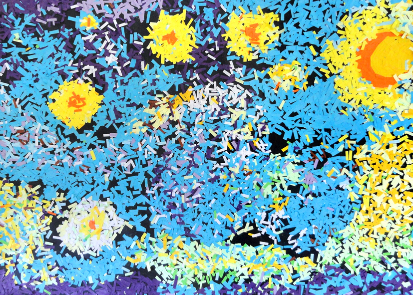 碎纸贴是将纸剪成小块,将设计好的平面形象拼贴而成,其艺术效果比较厚重。制作材料多选用彩色打印纸或废旧宣传广告纸。