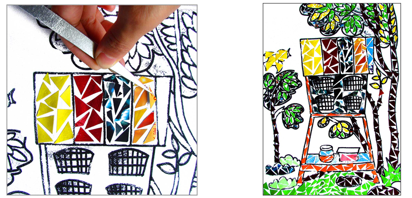 碎纸贴的制作方法是按照事先画好的草图,用铅笔轻轻的刻印在制作纸上,然后选择各局部彩色纸,用剪刀将其剪碎,纸的背面涂上乳白胶,用小镊子夹着粘贴到相应的部位。粘贴时应注意纸块之间最好留出细小缝隙,使纸贴作品的艺术效果更佳。