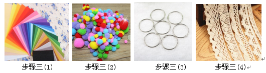 不织布、棉麻布、酒精胶、魔术粘扣、打孔器、麻绳、毛球、剪刀、针线等。