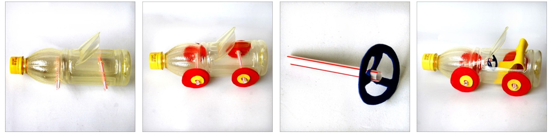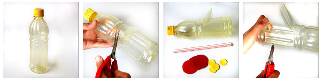 瓶类材料属于化工材料的一种,制作具体形象时,必须进行切割和裁剪,然后再粘合连接成新的形象。切割剪裁的方法是分段、剪口、开窗等。