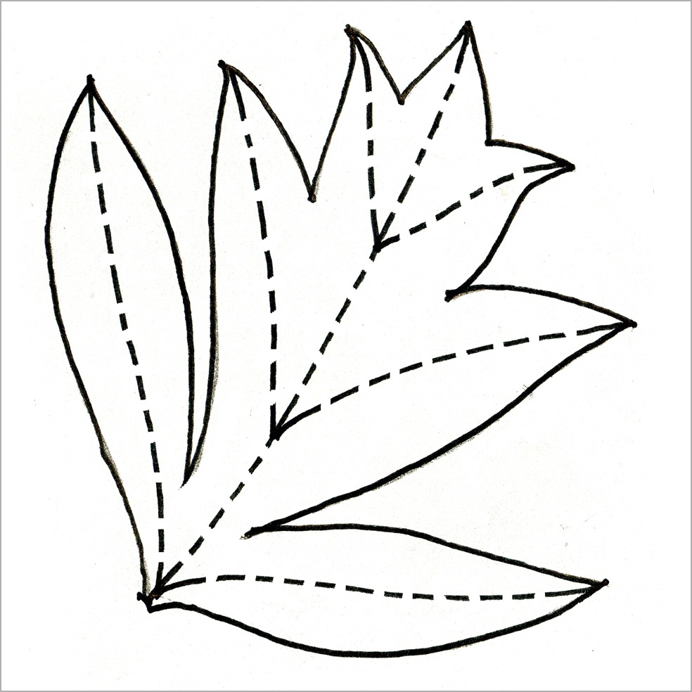 步骤三在纸的正面画一树叶形状,在树叶的正反面叶脉处画上虚线,然后沿虚线割痕;