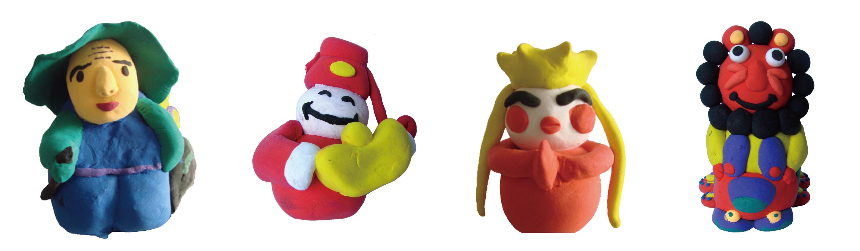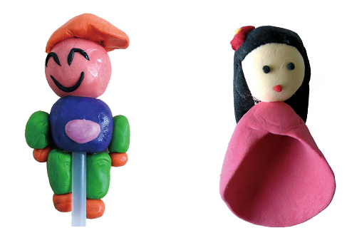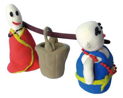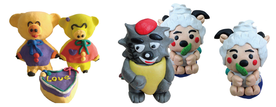 人物是幼儿非常喜欢的形象,书中的彩塑人物形象更加贴近儿童生活,而且加强了人物之间活动的情节性。学习人物造型,重点是围绕人物头、颈、躯干、上肢这些主要部位进行表现,要突出人物动态和神态的夸张性,色彩的审美性,教育教学的实用性。在人物造型的低端可以捏成手指大的洞口,做成手指木偶教具。通过这种探索,可以将获得的成功经验迁移到其它类别的造型处理中。