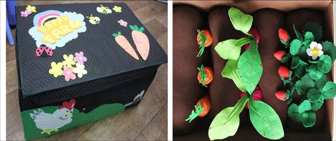 这是一个模拟小型农场菜园的玩教具,让孩子体验农民劳作,浇水、施肥、播种、种菜、采摘等活动,同时了解蔬菜的生长所需条件,以及想关的自然知识。