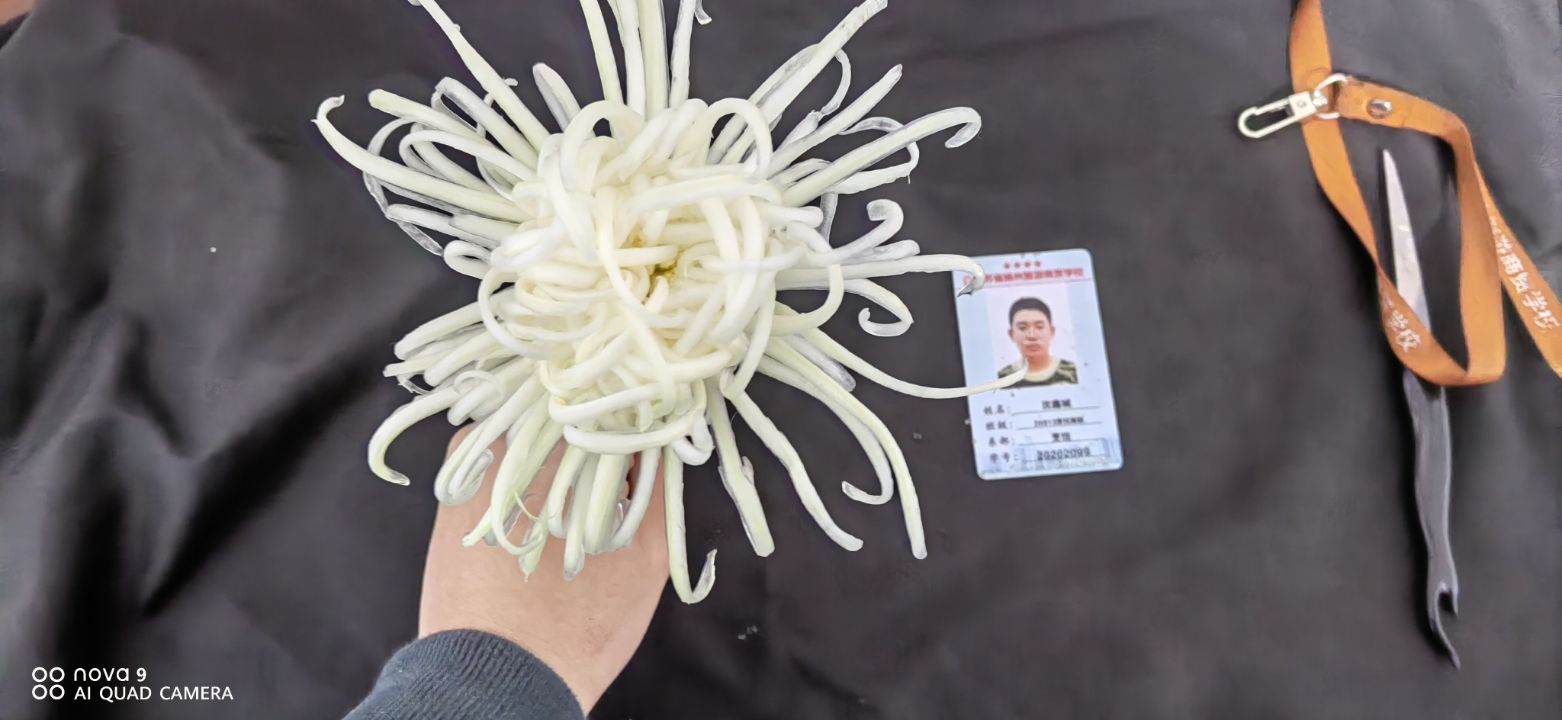 菊花雕刻是食品雕刻中的经典课题,融合了掏刀技法、分层理念、组装工艺与美学构图。通过本节课的学习,我们掌握了从原料处理、花芯雕刻、花瓣制作到茎叶搭配、整体组装的完整流程。