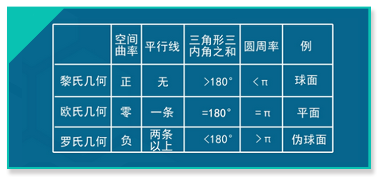在我们这个不大不小、不远不近的空间里,也就是在我们的日常生活中,欧式几何是适用的;在宇宙空间中或原子核世界,罗氏几何更符合客观实际;在地球表面研究航海、航空等实际问题中,黎曼几何更准确一些。