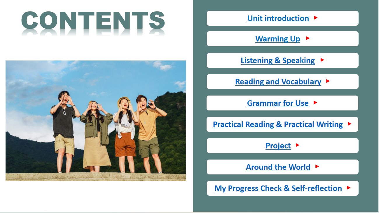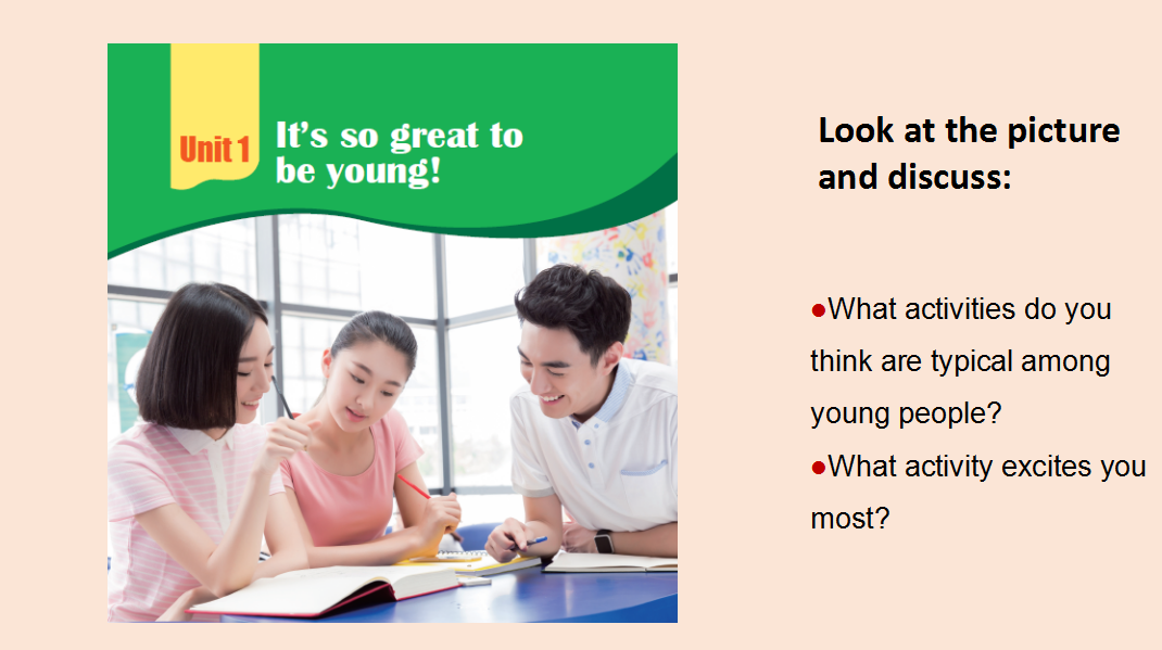 It's so great to be young! Playing sports with friends, dancing at music festivals, or exploring new places, youthful energy fuels countless activities. Being young is like going on an amazing journey and having a lot of fun. But what truly expresses the spirit of youth? It is about pursuing interests, showing creativity, being curious to explore the unknown, and making the world a better place. As we enjoy our youth, lets take every chance to live life to the fulleset! Now, let's move on to "Unit 1 It's so great to be young!”