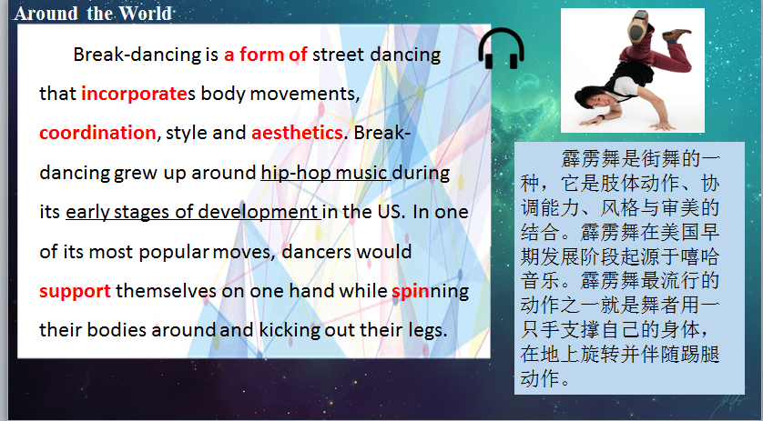 Breaking 地板舞(又译Breakdance,Breaking舞者统称为B-BOY、B-GIRL),是一种以个人风格为主的技巧性街舞舞种,也是北美街舞中最早的舞种。如今的Breaking,分为TopRock(摇滚步)、Footwork(腿部动作)、Freeze(空中定格)、Power Move(整体移动)四大内容,大量手撑地的快速脚步移动、各种倒立定格动作,以及在地板上或者空中匪夷所思的高难度旋转使这种舞蹈充满了视觉冲击力。