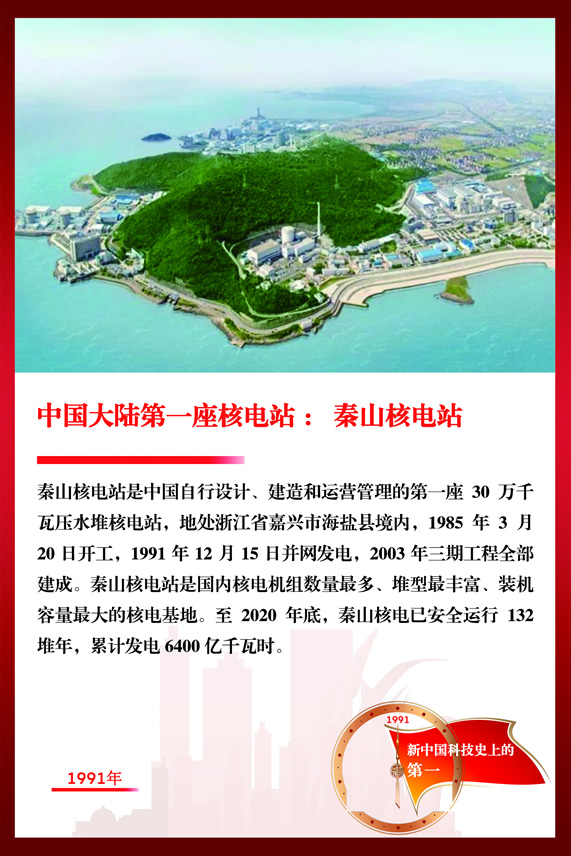 1970年2月,周恩来总理指示,“从长远来看,解决上海和华东用电问题,要靠核电。”遵照这一指示,在大量调研的基础上,中国第一座核电站结缘“红船”起航地,定址海盐秦山。由此,中国核工业开启了由保家卫国到经济建设的第二次创业。自1985年首台机组开工,秦山核电先后建成30万千瓦压水堆机组一台、65万千瓦压水堆机组四台、70万千瓦重水堆机组两台、100万千瓦压水堆机组两台,实现我国核电事业从无到有、跨越发展。