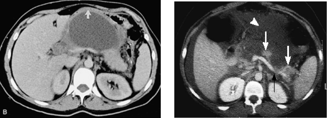 (2)B超可显示胰腺肿大、脓肿或假性囊肿