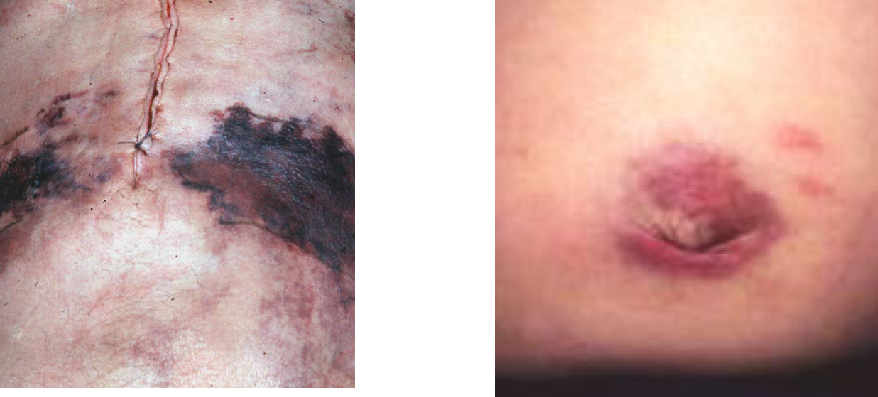 Grey-Turner征:两侧胁腹部皮肤可见暗灰蓝色斑