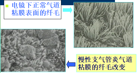 COPD的病理改变主要表现为慢性支气管炎及肺气肿的病理变化。支气管黏膜上皮细胞变性、坏死、增生,黏膜及黏膜下层炎症细胞浸润。急性发作期可见到大量中性粒细胞,严重者为化脓性炎症,黏膜充血、水肿、变性坏死和溃疡形成,基底部肉芽组织和机化纤维组织增生导致管腔狭窄;纤毛倒伏、变短、不齐、粘连,部分脱落。缓解期黏膜上皮修复、增生、鳞状上皮化生和肉芽肿形成。杯状细胞数目增多肥大,分泌亢进,腔内分泌物潴留。基底膜变厚坏死。支气管腺体增生肥大,腺体肥厚,与支气管壁厚度比值常大于0.55~0.79(正常小于0.4)。炎症导致气管壁的损伤-修复过程反复发生,进而引起气管结构重构、胶原含量增加及瘢痕形成,这些病理改变是COPD气流受限的主要病理基础之一。
