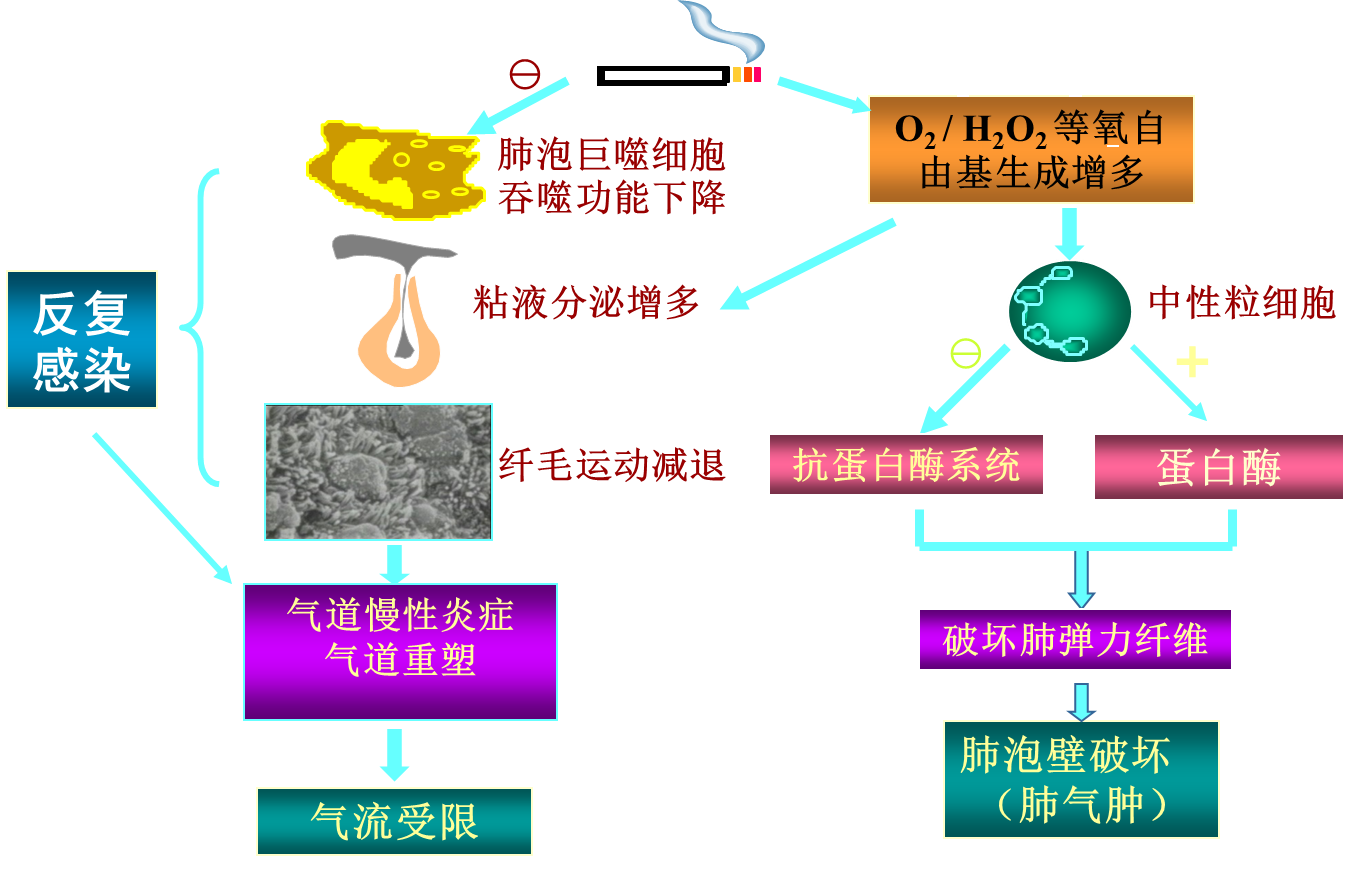 许多研究表明COPD患者的氧化应激增加;中性粒细胞、巨噬细胞、T淋巴细胞等炎症细胞也参与了COPD发病过程。气道、肺实质及肺血管的慢性炎症是COPD的特征性改变,中性粒细胞的活化和聚集是COPD炎症过程的一个重要环节,通过释放中性粒细胞弹性蛋白酶、中性粒细胞组织蛋白酶G、中性粒细胞蛋白酶3和基质金属蛋白酶引起慢性黏液高分泌状态并破坏肺实质。