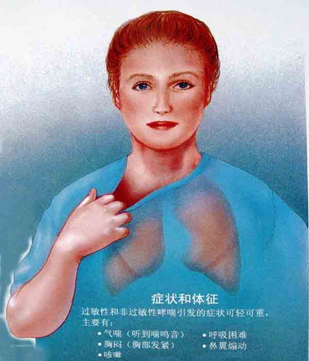 哮喘是一种常见的、慢性呼吸系统疾病,在不同的国家中占的比例从1%~18%不等。哮喘以可变的症状如喘息、气短、胸部紧迫感和(或)咳嗽为特征,伴有可逆的气流受限,症状和气流受限均随时间和强度改变,这些改变通常由锻炼、过敏原和刺激因素、天气改变或者病毒性呼吸道感染所诱发。