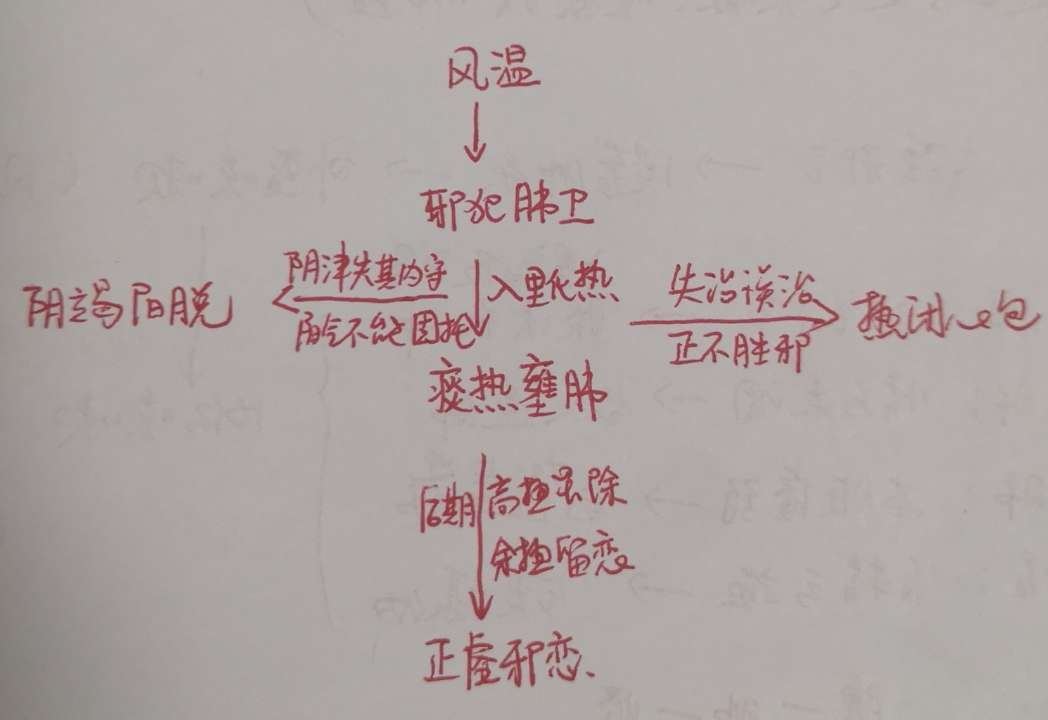 总之,肺炎病属外感病,病位在肺,与心、肝、肾关系密切。病分虚、实两类,以实者居多。风热疫毒之邪自口鼻而入,首先犯肺;或肺本有伏热,复感外邪而发。肺卫被伤,邪正相搏,化热入里,里热炽盛,炼液成痰,痰热内阻,肺失清肃,发为喘咳、胸痛等症。若治疗得当,邪退正复,可见阴虚内扰之低热、手足心热或口干舌燥之证候。若风温热邪,久羁不解,易深入下焦,下竭肝肾,导致真阴欲竭,气阴两伤,甚至热闭心包,损阴耗阳,导致阴竭阳脱。