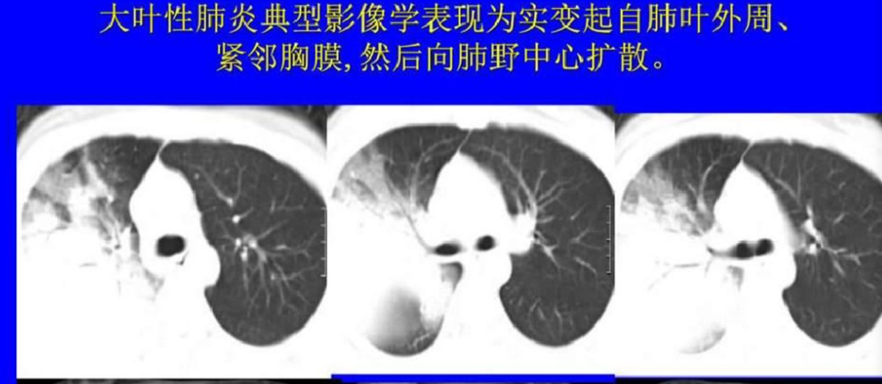 (1)肺炎球菌肺炎早期仅见肺纹理增粗或受累的肺段、肺叶稍模糊,随病情进展可见大片炎症浸润阴影或实变影,沿大叶、肺段或亚肺段分布,实变阴影中可见支气管充气征。肋膈角可有少量胸腔积液。消散期肺部炎性浸润逐渐吸收,可见散在的大小不一的片状阴影,继而变成索条状阴影,最后完全消散。如片块区域吸收较快,呈“假空洞”征。近年,由于抗生素的广泛应用,典型大叶实变少见,以肺段性病变多见。少数可见胸膜炎、气胸、脓胸等改变。老年患者因炎症消散较慢,容易吸收不完全而出现机化性肺炎。