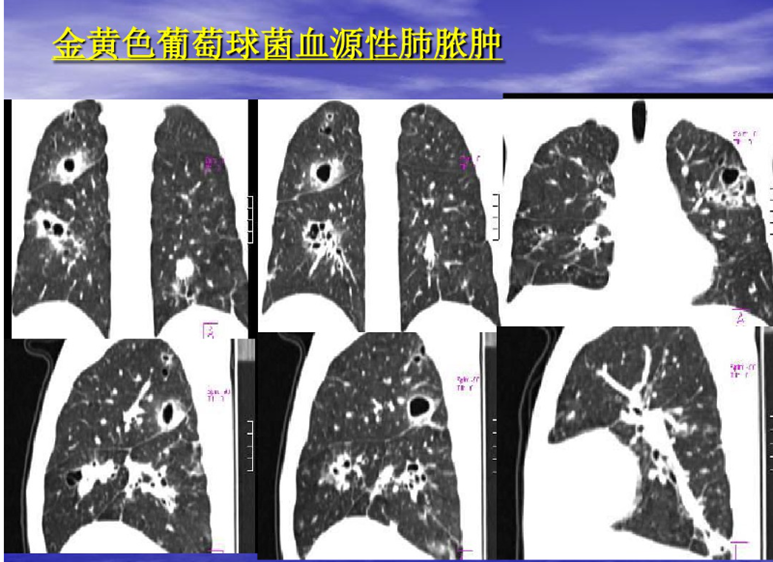 并发症:常可形成单个或多发性肺脓肿,穿破胸膜则导致气胸或脓胸。