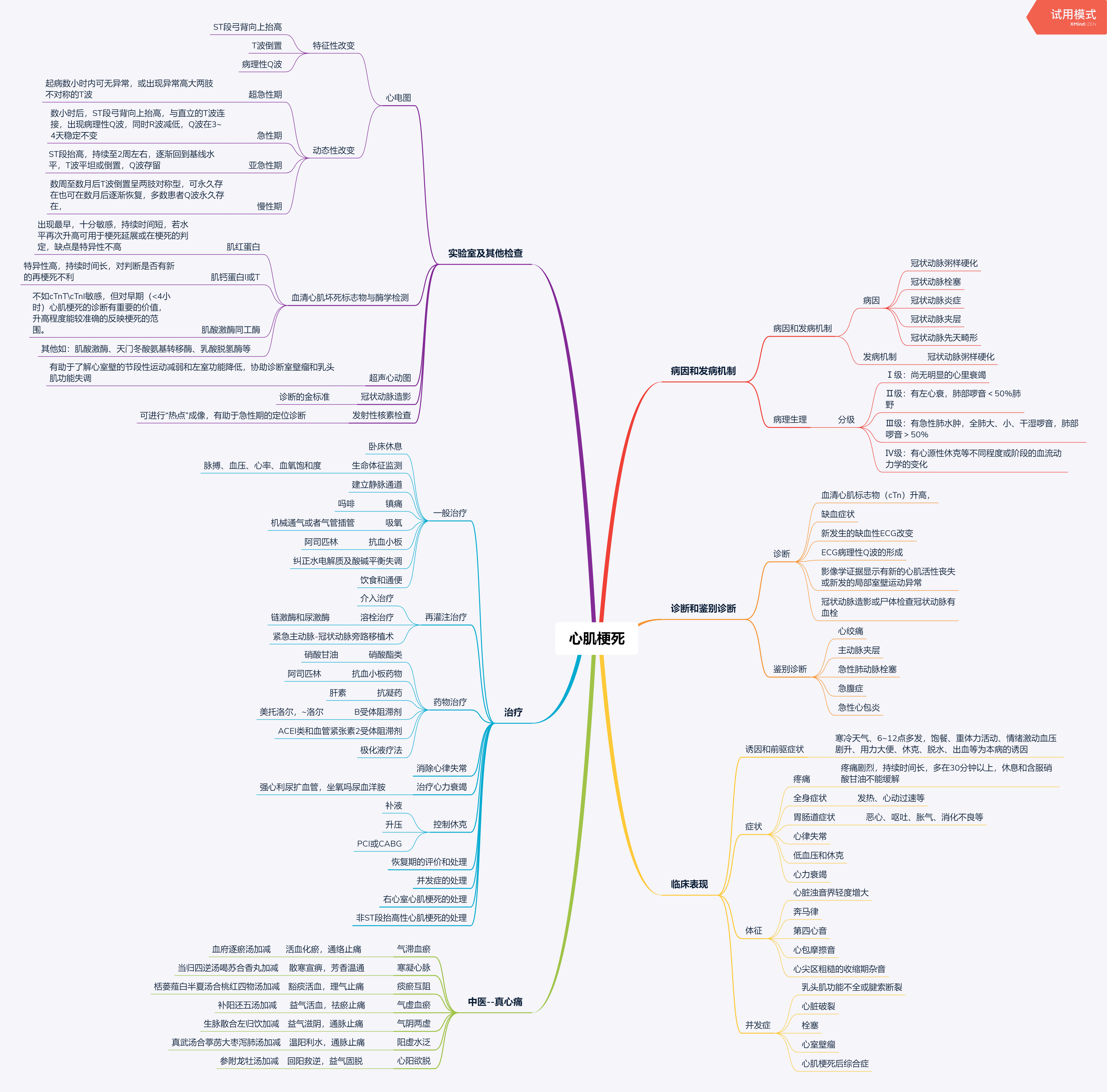 3 、重体力活动、情绪过分激动或血压剧升,致左心室负荷明显加重,儿茶酚胺分泌过多,心肌需氧需血量猛增,冠状动脉供血明显不足。心肌梗塞往往在饱餐特别是进食多量脂肪后,晨 6 时至 12 时或用力大便时发生。这与餐后血脂增高,血液粘稠度增高,血小板粘附性增强,局部血流缓慢,血小板易于集聚而导致血栓形成;上午冠状动脉张力高,机体应激反应性又增强,易使冠状动脉痉挛;用力排大便时心脏负荷增加等有关。心肌梗塞后发生的严重心律失常、休克或心力衰竭,均可使冠状动脉灌流量进一步降低,心肌坏死范围扩大。