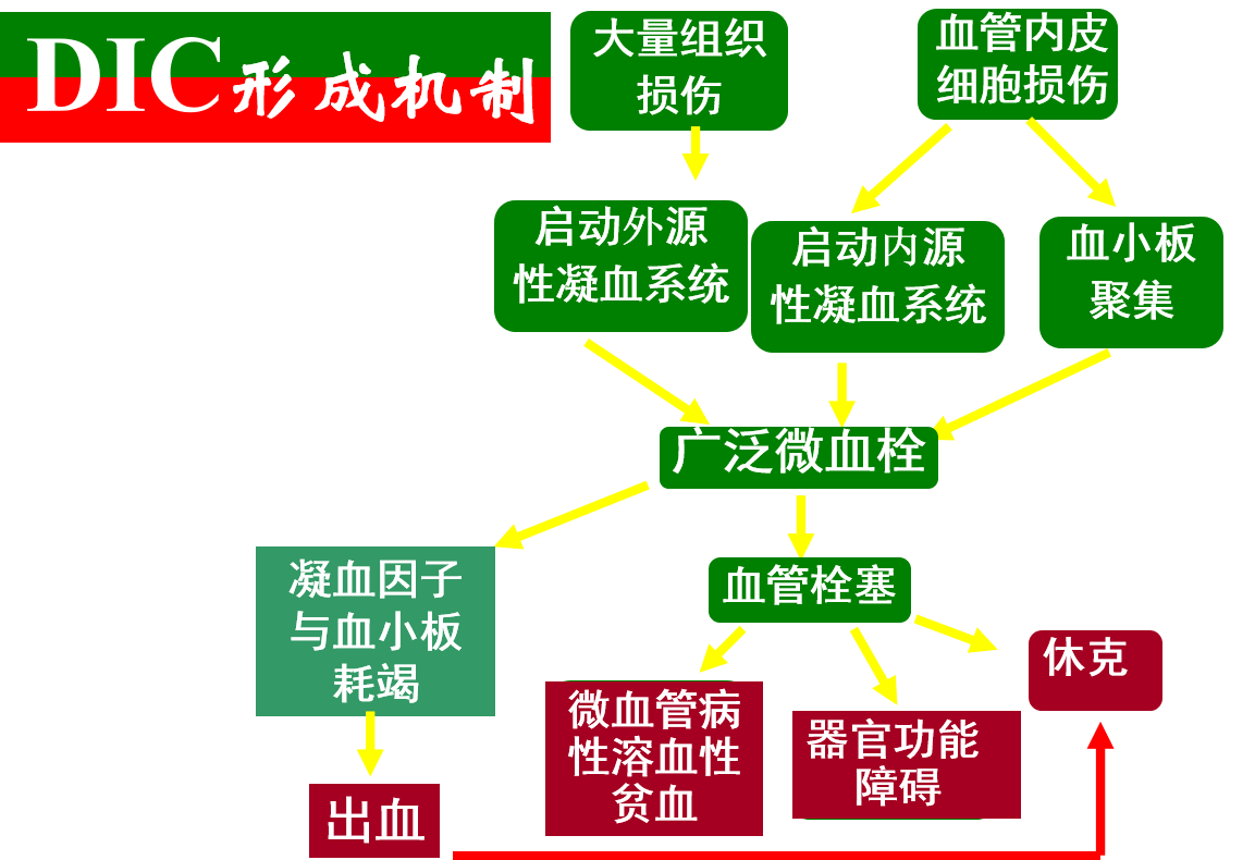 弥散性血管内凝血(disseminated intravascular coagulation,DIC)是一种发生在许多疾病基础上,由致病因素激活凝血系统,导致全身微血栓形成,凝血因子和血小板被大量消耗并继发纤溶亢进,引起全身出血及微循环衰竭的综合征。