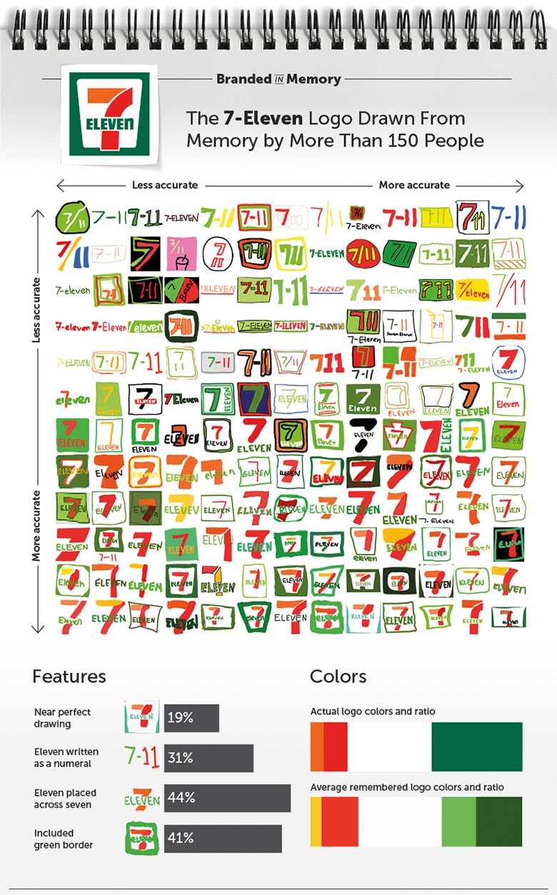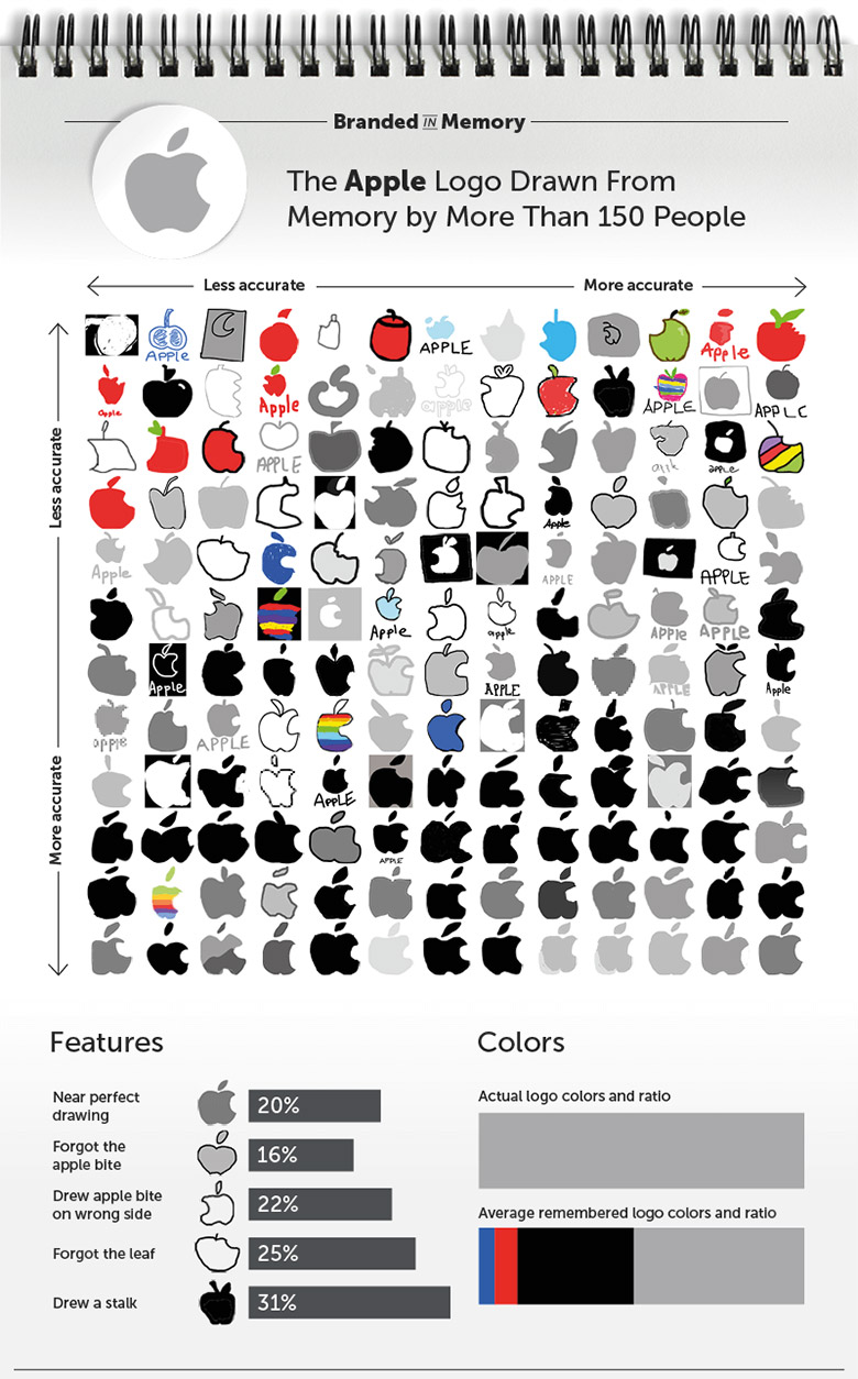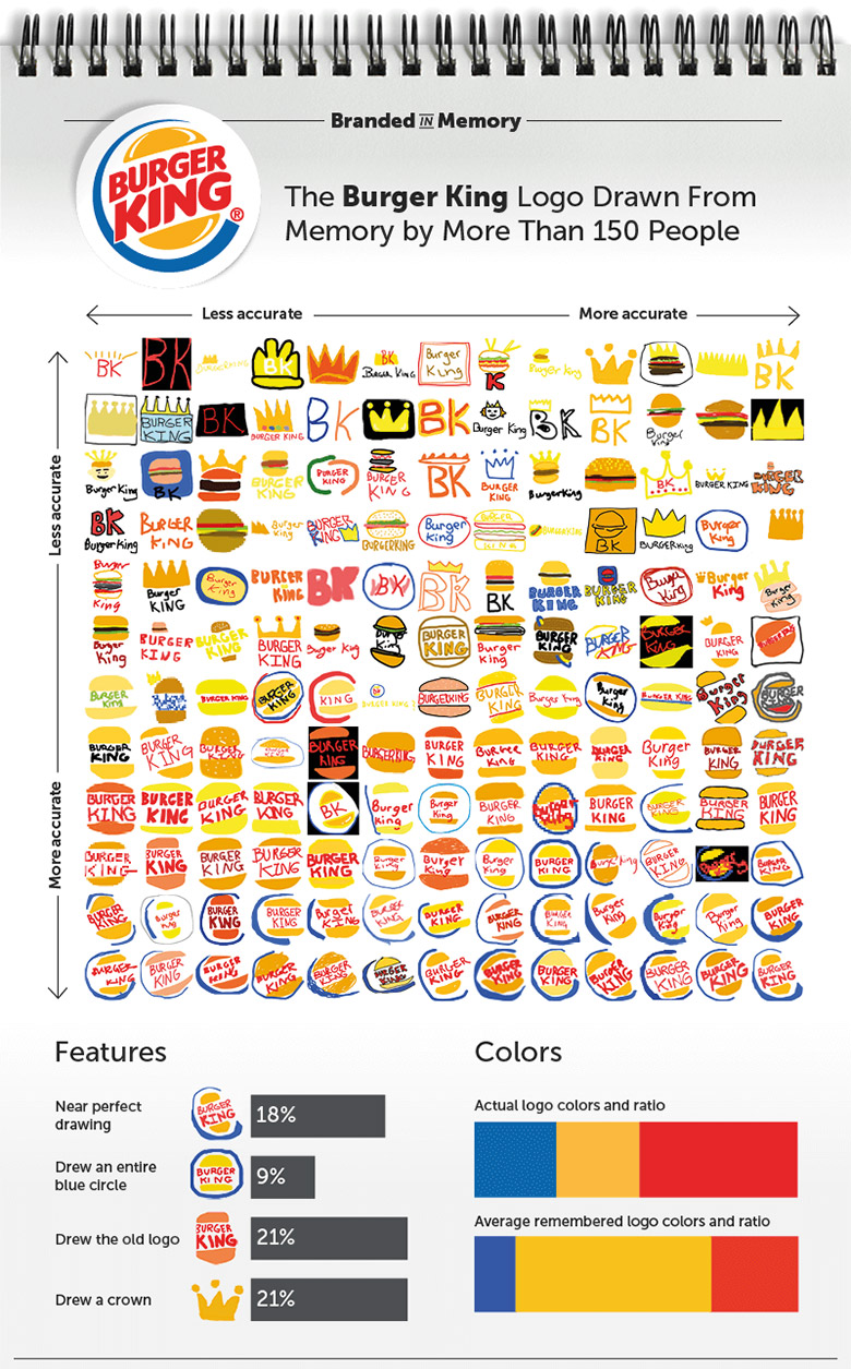 结果表明,这些无处不在的品牌标志在人们的脑海中绝大部分都处于模糊的视觉状态。大多数人能够记住品牌的准确或者接近准确的色彩,而标志的形状和元素则相对更加难于记忆。同时,由于品牌标志随着时间的推移而发送了变化,有小部分人将旧版本和新版本的标志搞混。总而言之,在此次参与测试的150个人中,有16%的人能够很完美的凭借记忆画出对应的品牌标志,有37%的人能够画出来,但并不完美。总之,标志越复杂,记住它的可能性就越小。