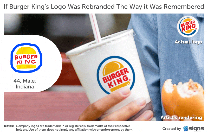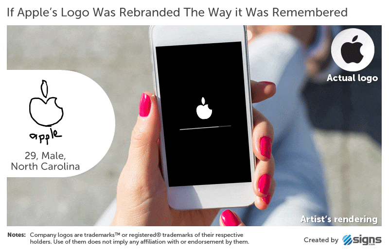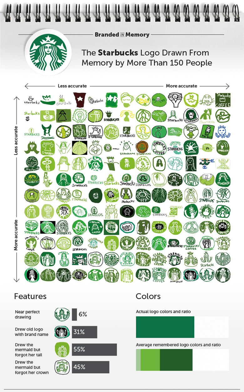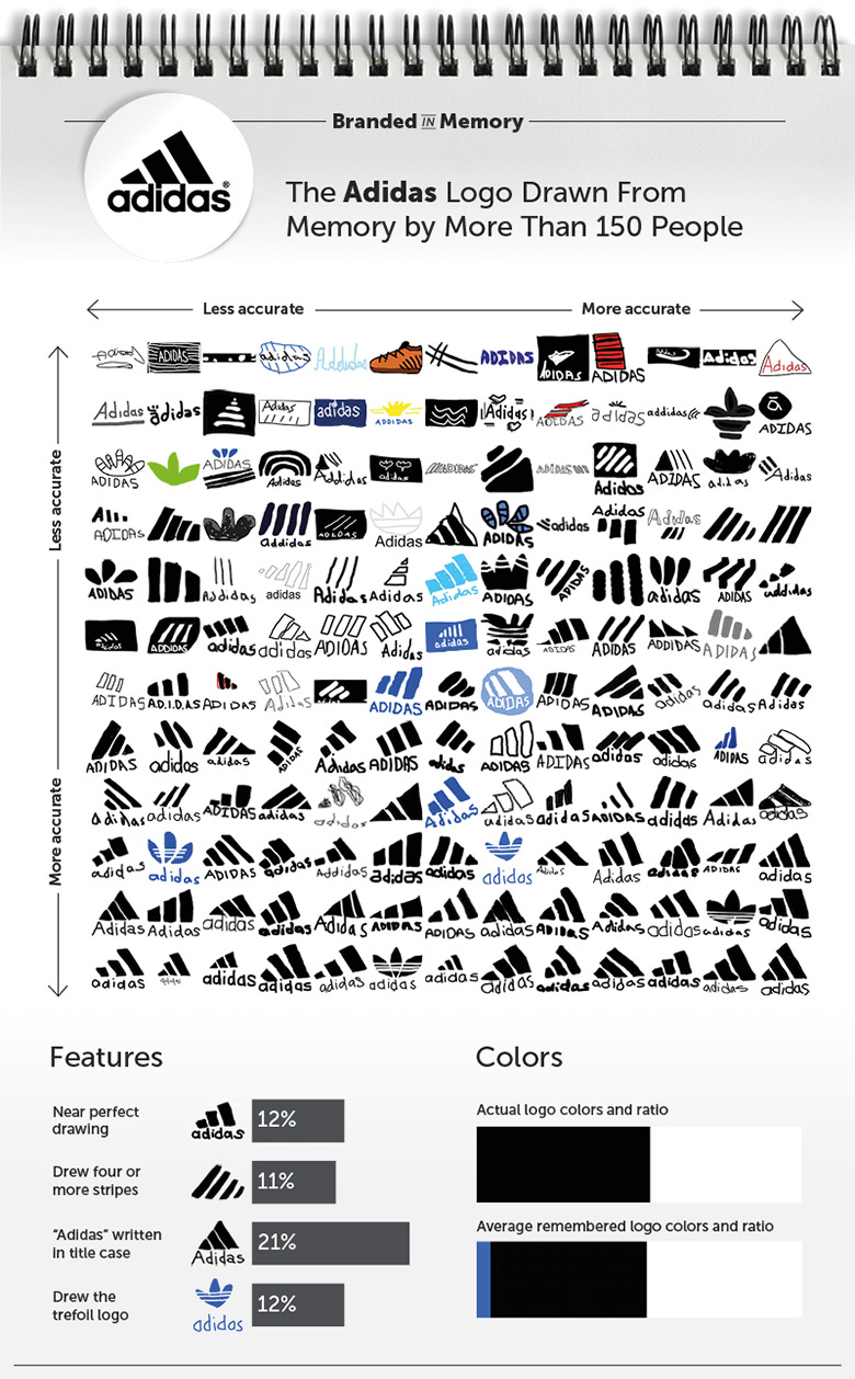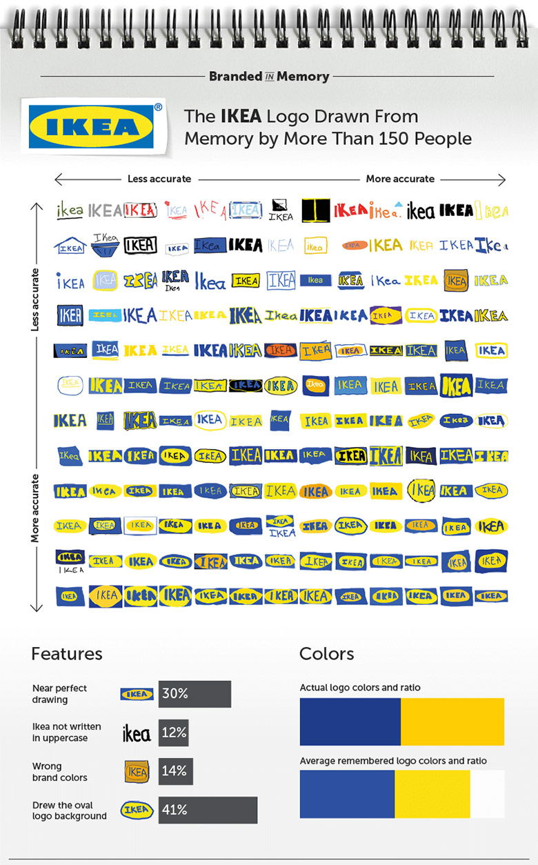 结果表明,这些无处不在的品牌标志在人们的脑海中绝大部分都处于模糊的视觉状态。大多数人能够记住品牌的准确或者接近准确的色彩,而标志的形状和元素则相对更加难于记忆。同时,由于品牌标志随着时间的推移而发送了变化,有小部分人将旧版本和新版本的标志搞混。总而言之,在此次参与测试的150个人中,有16%的人能够很完美的凭借记忆画出对应的品牌标志,有37%的人能够画出来,但并不完美。总之,标志越复杂,记住它的可能性就越小。