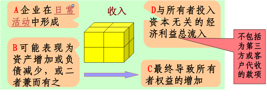 收入是指企业在日常活动中形成的、会导致所有者权益增加的、与所有者投入资本无关的经济利益的总流入。日常活动是企业为完成经营目标所从事的经常性的以及与之相关的活动。是持续的、可重复的活动。