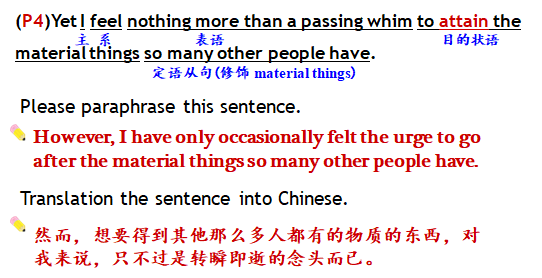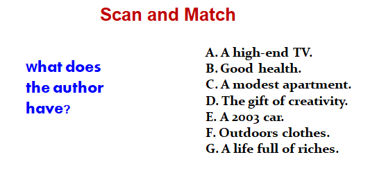 | 2 | 3~12 | In search of an answer the writer finds that not having expensive possessions doesn’t make him feel poor mainly because he enjoys life in many other ways. |