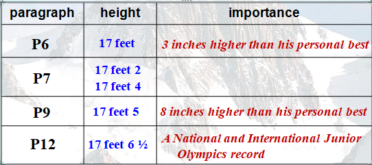 | 1 | 1~2 | Michael faced the most challenging competition in his pole-vaulting career. |