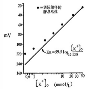 图中的圆点是不同 K + 浓度时静息电位的实测值;直线是根据 Nernst 公式的计算值