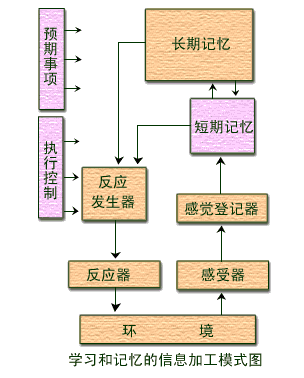 读者可能已注意到图左侧的期望事项与执行控制。期望事项是指学生期望达到的目标,即为学习的动机。正是因为学生对学习有某种期望,教师给予的反馈才会具有强化作用。执行控制即加涅所讲的认知策略,执行控制过程决定哪些信息从感觉登记进入短时记忆、如何进行编码、采用何种提取策略等。由此可见,期望事项与执行控制在信息加工过程中起着极为重要的作用。加涅所以不把这两者与学习模式中其他结构联结起来,主要是由于:(1)这两者可能影响信息加工过程中的所有阶段;(2)它们之间相互联结的关系目前还不很清楚。