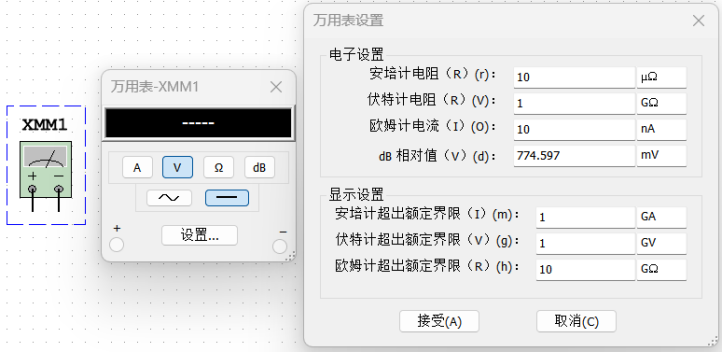 3.Set 按钮,设置万用表参数。单击Set 按钮,弹出参数设置对话框。