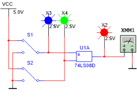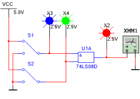放置与门74LS08、开关、指示灯和万用表,测试电路如图1-27所示。与逻辑功能为有0出0,全1出1。