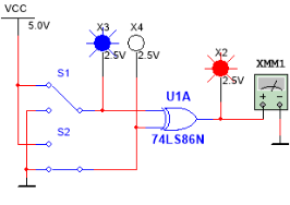 放置异或门74LS86、开关、指示灯和万用表,测试电路如图1-30所示。异或逻辑功能为相异为1,相同为0。