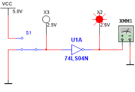 放置非门74LS04、开关、指示灯和万用表,测试电路如图1-29所示。非逻辑功能为有1出0,全0出1。