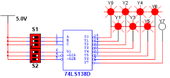 启动仿真,拨动逻辑开关,输入A、B、C不同组合,观察输出指示灯,验证74LS138 的逻辑功能。如图3.16所示,ABC=111,,输出低电平,对应的灯不亮,其余输入端均为高电平。