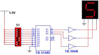 打开Multisim软件,放置8线-3线优先编码器74LS148 建立如图3.15所示的测试电路。图中开关S1控制编码器的八个输入端,开关向左拨动为高电平1,向右拨动为低电平0,输入端低电平有效,拨动开关使得编码器选取不同的输入信号;由于输出端低电平有效,需要通过反相器反相后驱动数码管显示相应的数字,数码管最高位接低电平。