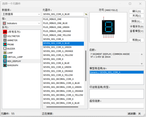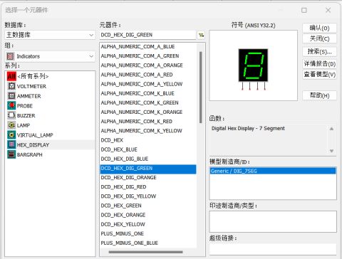 打开Multisim软件,点放置指示器,左侧列表中显示各种指示灯,其中HEX-DISPLAY为数码管库,如图4.17所示,下面介绍两种常用的数码管。