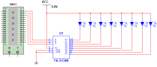 设计思路:本项目要求利用3线-8线译码器设计制作一个循环流水灯,电路启动之后,灯按照一定频率依次点亮,往复循环。根据项目要求,将译码器74LS138三位输入端接字发生器,循环产生000、001、010、011、100、101、110、111,八位输出将依次输出低电平,要利用低电平驱动发光二极管点亮,需要将发光二极管的负极接输出端,正极接电源,三个使能端分别接入100,利用电路实际制作时要加限流电阻。设计电路如图3.14所示。