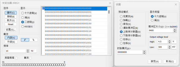 双击字发生器,将控件设置为“循环”;触发设置为“内部”;显示设置为“二进制”;频率设置为10Hz;点击设置,预设模式设置为“上数序计数器”,即加法计数器。点击运行按钮,可以清楚的看到低三位二进制从000到111往复循环,如图3.15 所示。