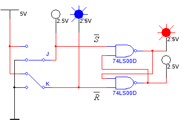 拨动开关,令,触发器两个输出灯都亮,这和触发器输出必须互反项违背,实际使用时不允许出现。