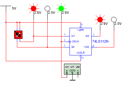 放置集成JK触发器74LS112,将JK触发器的J、K触发端接三脚开关,直接置0(复位)端和直接置1(置位)端接高电平,时钟端接入函数发生器,设置波形为方波,频率为1HZ,1HZ的目的是为了方便观察灯的闪烁,设置界面如图5.9所示。测试电路如图5.11所示。
