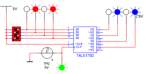 放置集成D触发器74LS175,将D触发器的四个D触发端接四路开关,清零端CLR接高电平,时钟端接入信号源,设置波形为方波,频率为1HZ,1HZ的目的是为了方便观察灯的闪烁,测试电路如图5.12所示。
