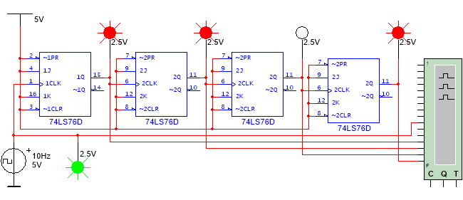 打开Multisim软件,放置4个JK触发器 74LS76,时钟端接信号源,设计波形为矩形波,占空比50%,频率10Hz,振幅5V,将四个触发器的输出接2.5V指示灯,用来显示输出状态,将J、K接高电平1,根据触发器功能可知,触发器出于翻转状态,前一个触发器的输出Q做为下一个触发器的时钟脉冲源,当前一个触发器从高电平向低电平跳变的时候,下一个触发器翻转,从而实现了加法计数。测试电路如图7.27所示。打开逻辑分析仪面板,可以观察波形。