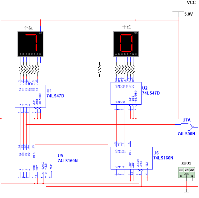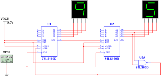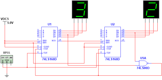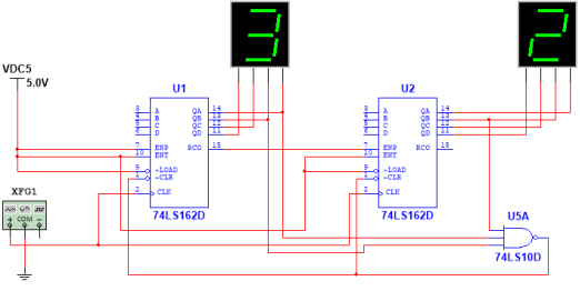 分别利用十进制计数器74LS160、74LS162实现60进制计数器,方法和24进制计数器一样,读者自行分析。测试电路如图如图7.32所示。