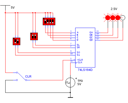 打开Multisim软件,放置4位双向移位寄存器 74LS194,时钟端接信号源,设计波形为矩形波,占空比50%,频率1Hz,振幅5V,将移位寄存器输出接2.5V指示灯,用来显示数据移动状态,将并行数据输入端ABCD接四路逻辑开关,通过开关通断表示二进制0和1,将工作方式控制端S1和S0接两路逻辑开关,右移串行数码输入端SR和左移串行数码输入端SL接两路逻辑开关,将清零端CLR接三脚拨动开关,被测电路如图7.28所示。