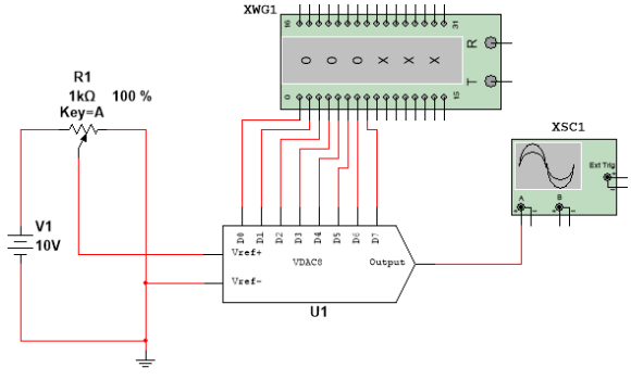 在 Multisim 中,单击“放置杂项元件”→ “ADC _ DAC” →“DAC” 命令,放置 DAC,如图8.12所示。它是一个8位的 DAC ,Vref +为参考电压“+”端, Vref -为参考电压“-”端, Vref +与Vref -端的电压差表示要转换的模拟电压范围,也就是DAC的满度输出电压,D7~D0是8位数字量输入端,Output 为DAC转换的模拟电压输出端。